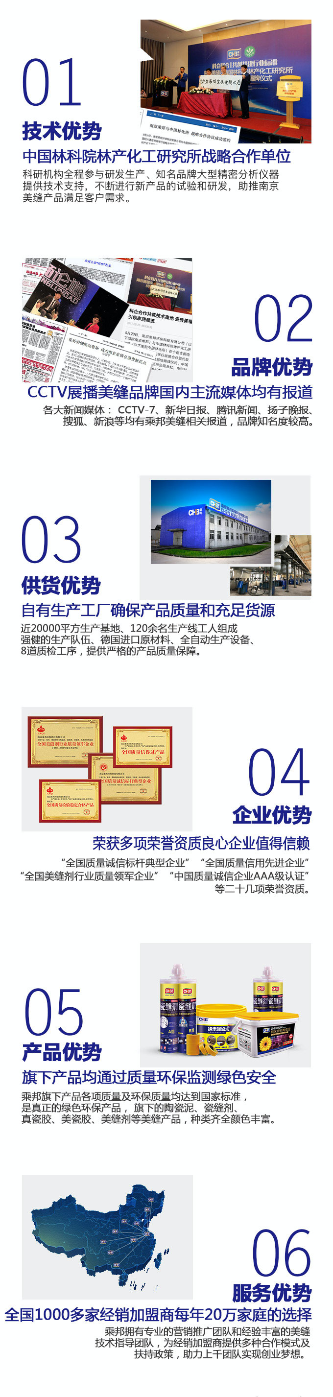 南京乘邦環(huán)保科技有限公司成立于2005年,是集南京瓷磚美縫南京美縫施工、高科技產(chǎn)品的研發(fā)與銷&售等產(chǎn)業(yè)的南京瓷磚美縫公司。目前公司主打美縫產(chǎn)品為國內(nèi)推出的傳統(tǒng)美縫劑升級產(chǎn)品:乘邦納米陶瓷泥、水性環(huán)氧彩砂,天然砂質(zhì)顏料,化妝品般安全無污染。乘邦陶瓷泥顏色豐富,大大提升裝飾效果,打造魔幻家居,讓家也可以炫酷起來。它綠色環(huán)保防霉防污,堅硬如瓷細(xì)膩光潔,不僅做到瓷磚縫隙“不變黑”,而且在為每一個家庭健康美麗而努力,這是乘邦公司的最高準(zhǔn)則,也是乘邦人為之努力奮斗的目標(biāo),以此目標(biāo)乘邦本著"誠信、合作、專業(yè)、超越"的理念,詮釋優(yōu)質(zhì)服務(wù),演繹品質(zhì)生活。同時公司擁有一支管理完善、經(jīng)驗豐富的專業(yè)美縫施工隊伍。在南京瓷磚美縫價格方面也有很大的優(yōu)勢,每年為南京近萬家庭提供美縫服務(wù),其自主研發(fā)的乘邦牌產(chǎn)品在10余省市已有近千個代理商,在全國范圍內(nèi)享有很高的知名度。